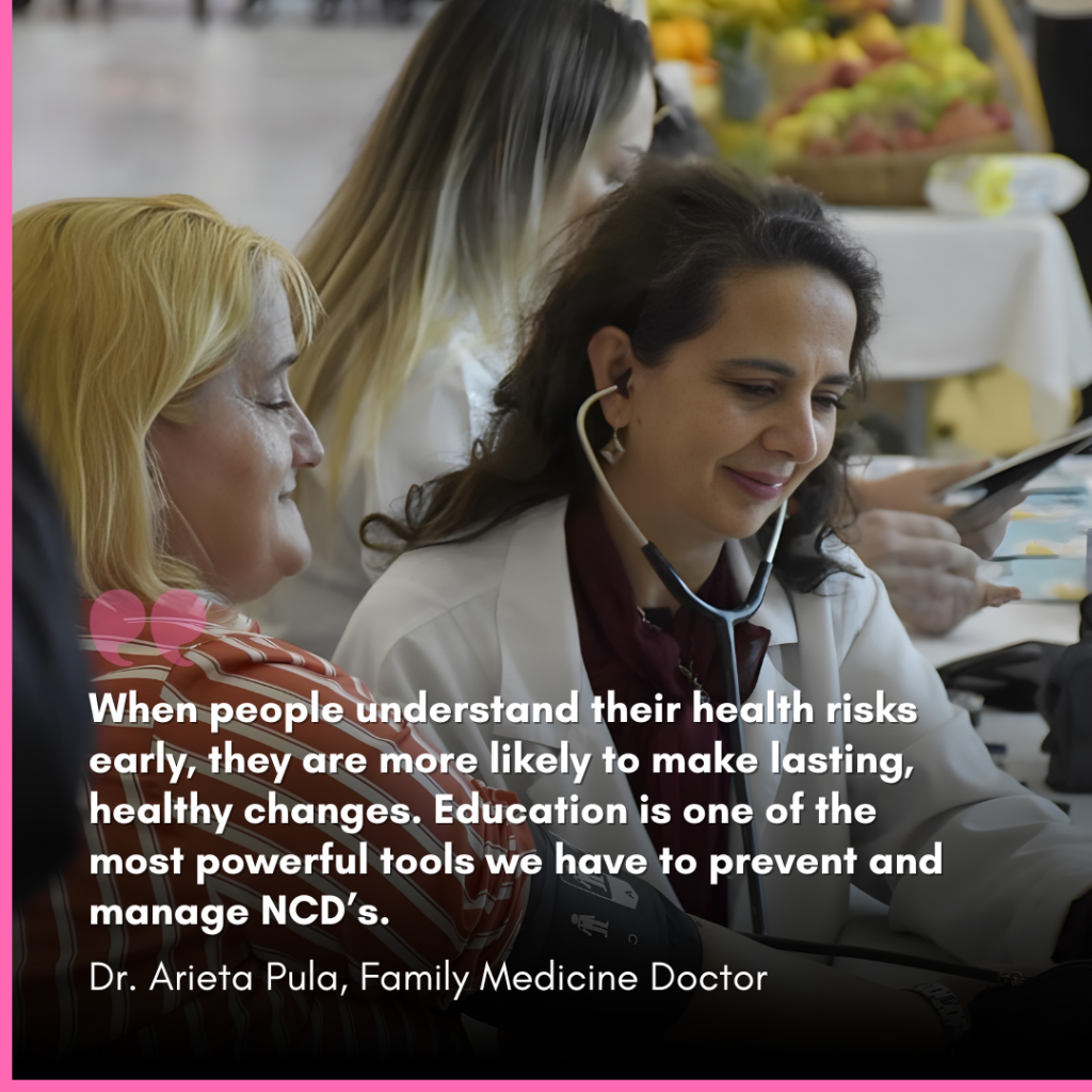 “When people understand their health risks early, they are more likely to make lasting, healthy changes. Education is one of the most powerful tools we have to prevent and manage NCDs,” explains Dr. Arieta Pula, FamilyMedicine Doctor, while attending targeted awareness sessions on NCDs with communities in Prishtina.